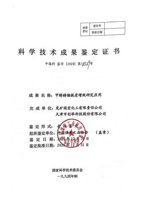 2020年底,中國煤炭工業(yè)協(xié)會組織有關(guān)專家,對國宏公司及創(chuàng)舉科技共同申報(bào)的“甲醇精餾提質(zhì)增效研究應(yīng)用”技術(shù)進(jìn)行科學(xué)技術(shù)成果鑒定。經(jīng)專家鑒定,該項(xiàng)技術(shù)成果達(dá)到“
