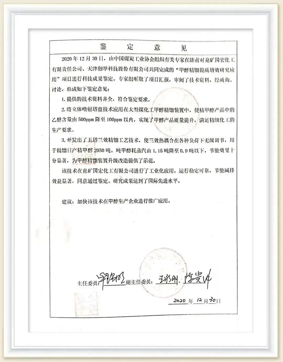 2020年,由兗礦國(guó)宏公司及創(chuàng)舉科技共同申報(bào)的“甲醇精餾提質(zhì)增效研究應(yīng)用”順利通過(guò)中國(guó)煤炭工業(yè)協(xié)會(huì)科學(xué)技術(shù)成果鑒定,并鑒定該項(xiàng)技術(shù)成果達(dá)到“國(guó)際先進(jìn)”水平。