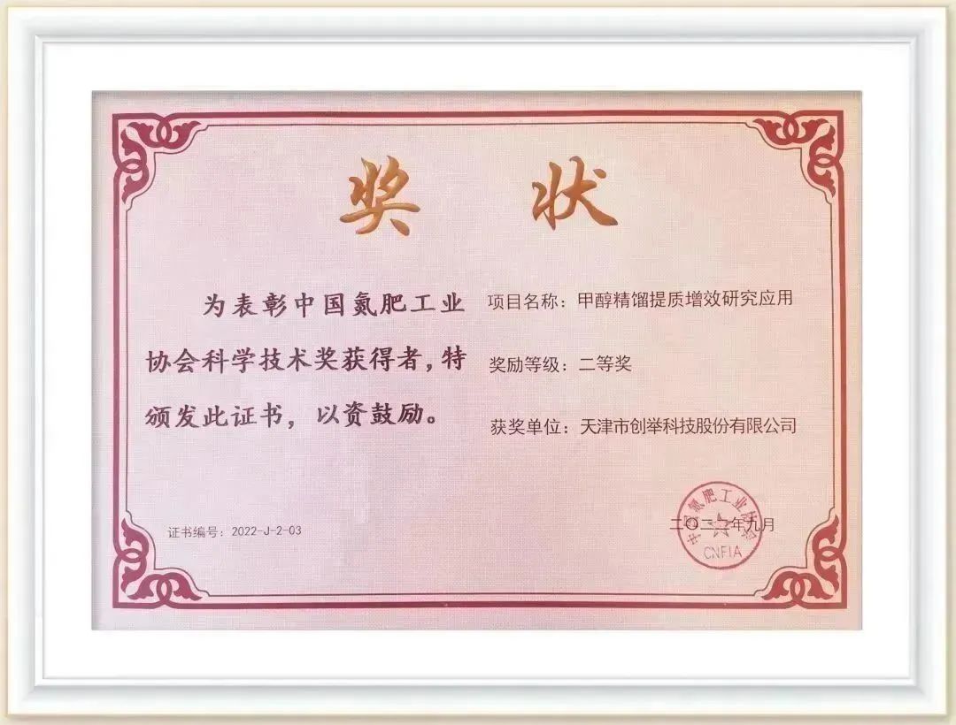2022年,創(chuàng)舉科技申報(bào)的“甲醇精餾提質(zhì)增效研究應(yīng)用”項(xiàng)目,榮獲中國(guó)氮肥工業(yè)協(xié)會(huì)科學(xué)技術(shù)獎(jiǎng)二等獎(jiǎng)。